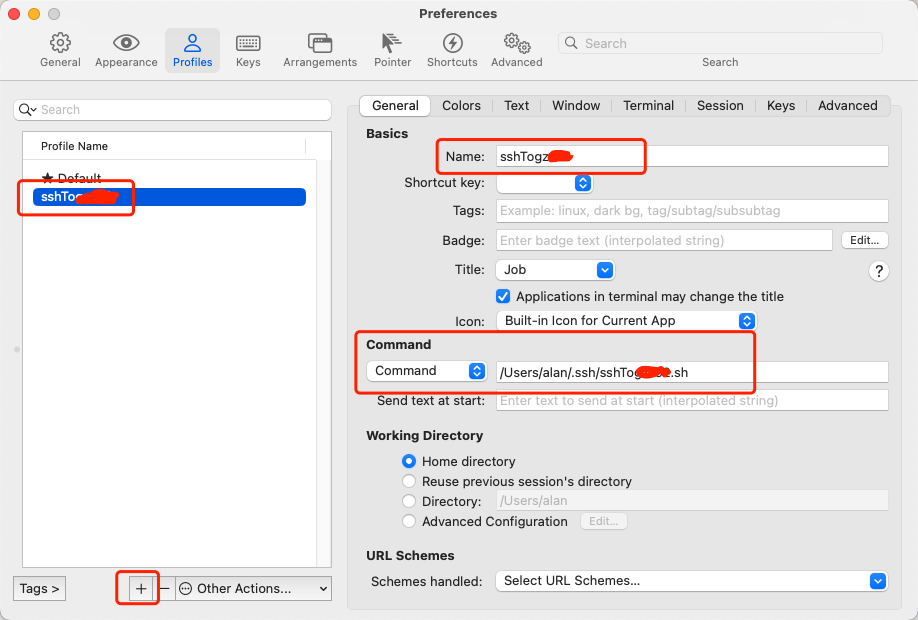 在iTerm2菜单栏Settings打开Preferences,选择Profiles,新建一个Profile,输入Name,Command脚本地址,然后保存即可。